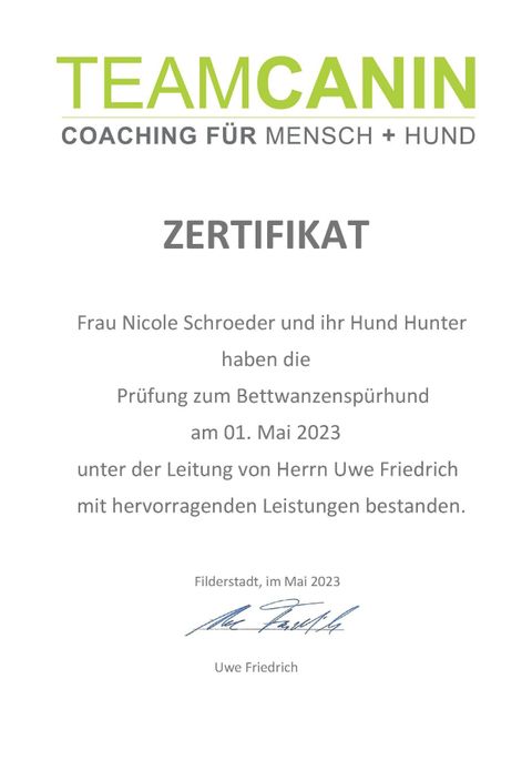 „Wir waren mit der Arbeit von Frau Schroeder und ihrem Kollegen Herr Göhner mehr als zufrieden und sehr dankbar für ihren Bettwanzen-Spürhunde Service.